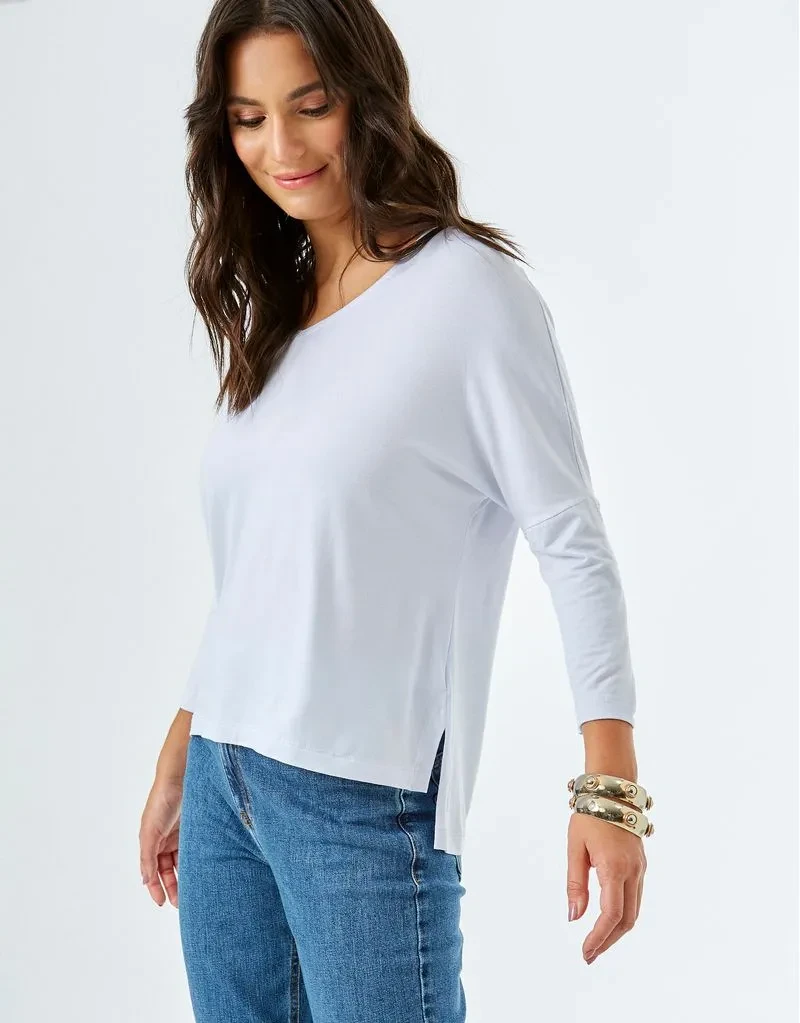Blusa confeccionada em malha crepe de viscose, shape solto, comprimento alongado, decote arredondando com detalhe em viés, mangas 7/8 e justas e possui fendas na lateral e detalhe pespontado. (modelo veste P)